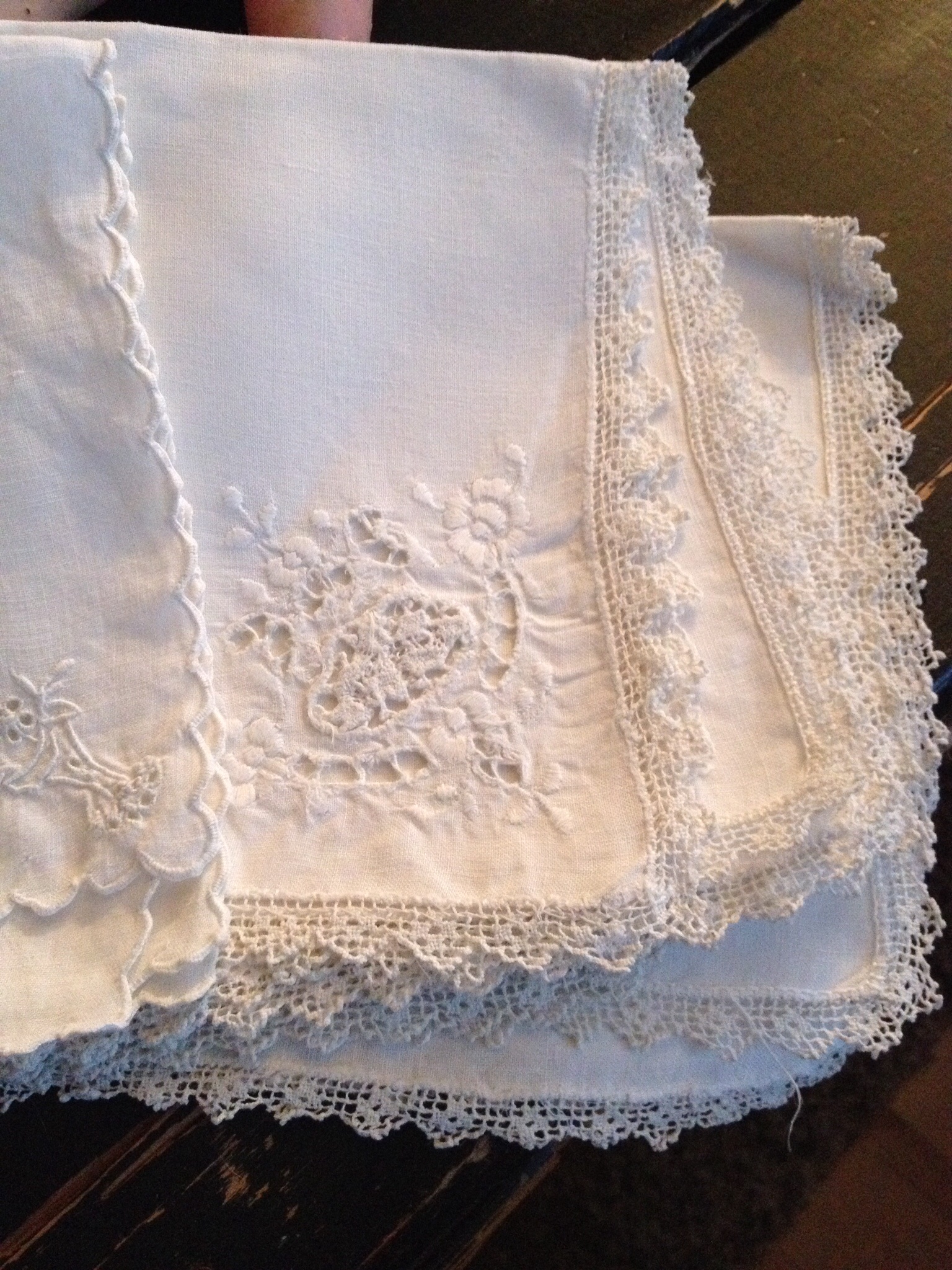 While she is being measured for clothes, we thought it would be interesting to go over the fabrics we have assembled to make some clothes. We will start with the traditional doll bloomers, made of fine lawn fabric (a lightweight, semi-transparent or sheer cloth), with lace and pin-tucks. A slip or chemise, also of a fine lawn and trimmed with lace. We have a collection of antique napkins and hankies edged in handmade lace, some in the perfect weight of fabric for doll bloomers and a chemise. Some of these linens are hand-stitched, from a time long long ago, picked up here and there and squirreled away for a time like this.